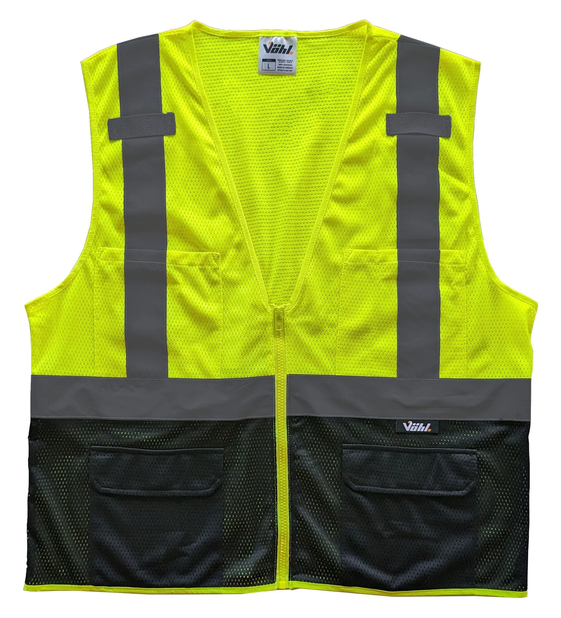 Lightweight, breathable, high visibility construction vest with 360-degree reflectivity and color blocking for additional contrast and reduction of visible dirt.